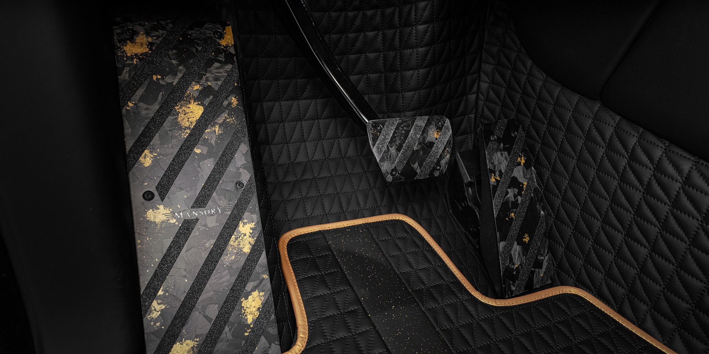 Black leather with gold-coloured piping is used in the interior. As with the exterior, all carbon parts in the interior are decorated with real gold inlays and all standard parts otherwise finished in chrome or silver are painted gold, so that only the colours black and gold appear in the interior without exception. Real gold inlays are also used in the centre console and pedals.