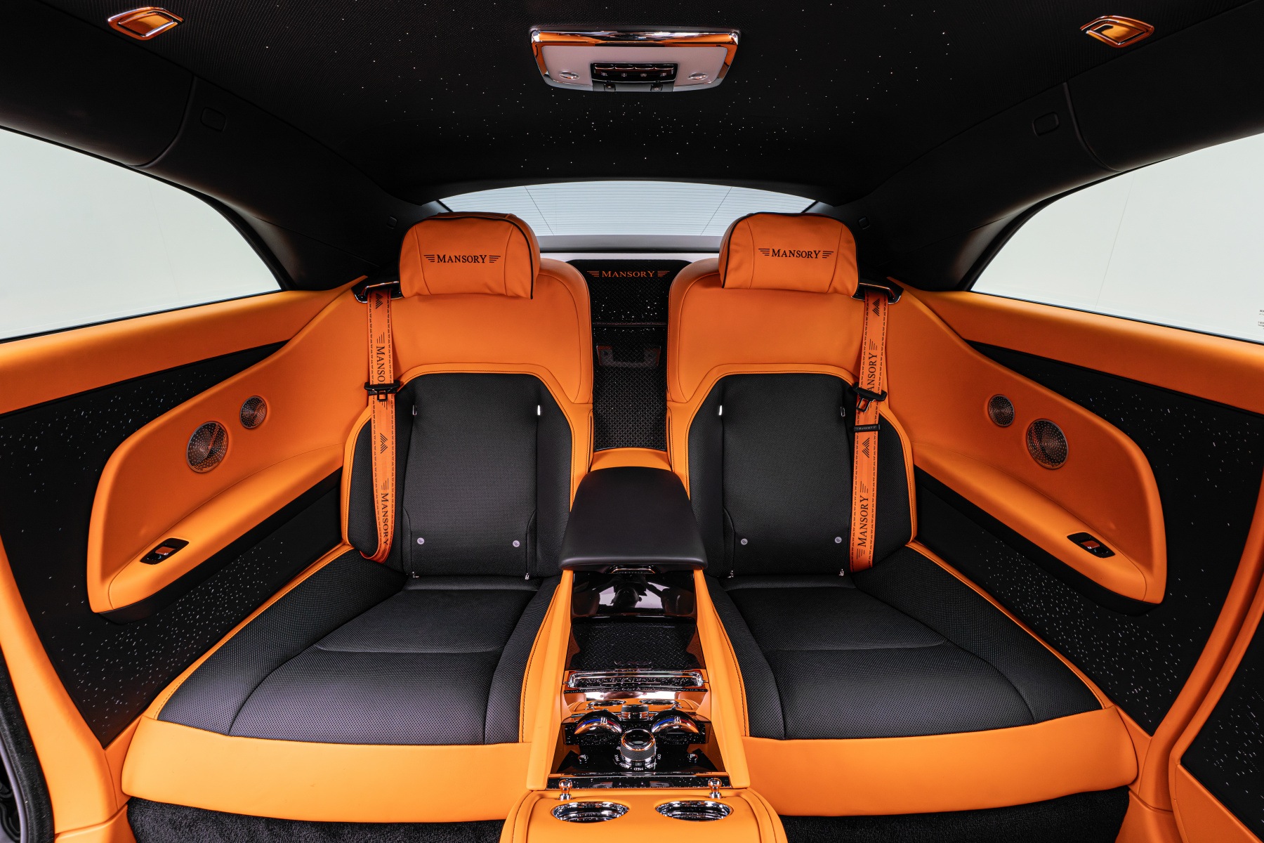 Fixed (non-rotating) wheel hub caps with MANSORY logos are installed on both wheel sets.